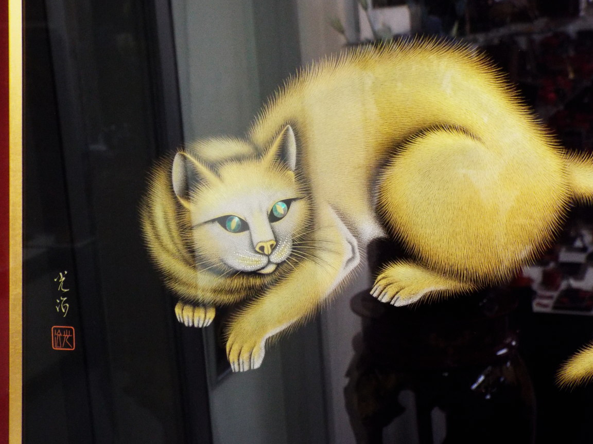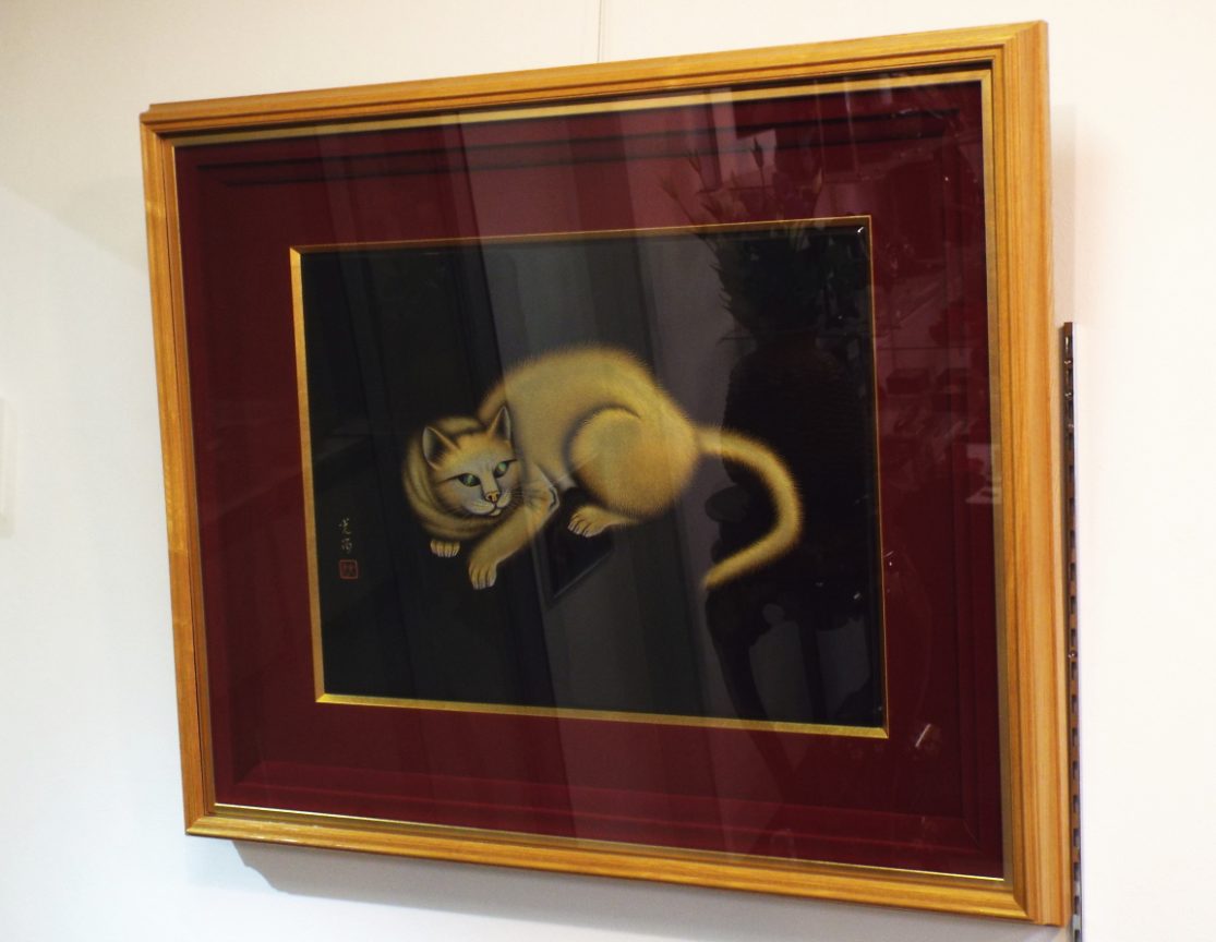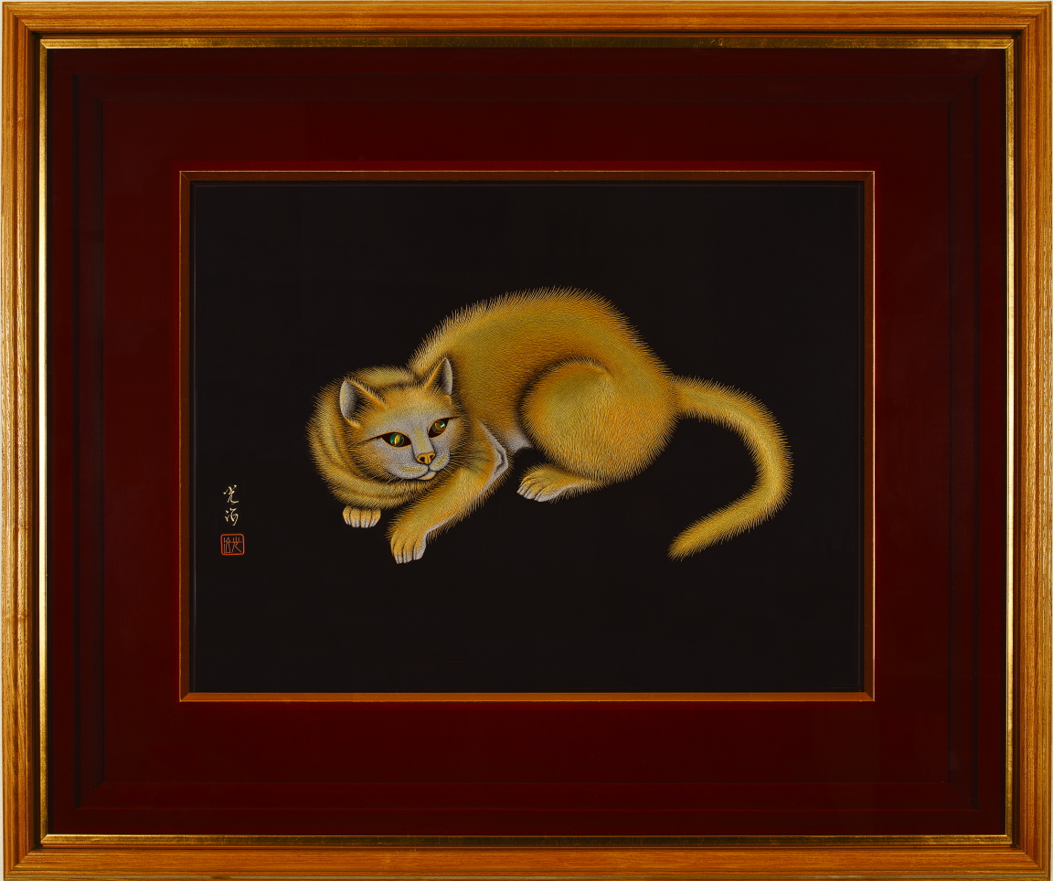 漆絵 猫(沈金・板谷光治 作) 漆芸家・板谷光治(1925~2006)が制作した猫の漆絵(沈金)です。毛の一本一本にまで躍動感を感じさせる猫の姿を、高い沈金の技術で立体感を出しながら、見事に表現した珠玉の一品です。 横50cm×縦38cm(絵) W79cm×D66cm×H8cm(額) 定価370万円(税込4,070,000円)※板谷光治:漆芸家。人間国宝の前大峰(1890~1977)に師事し、平面的な沈金の技法で動きや立体感を表現する、芸術性の高い技を受け継ぐ。昭和63年第35回日本伝統工芸展では文部大臣賞を受賞。